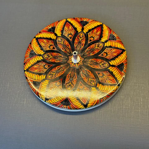Com tons intensos de laranja, amarelo e preto, este incensário em resina carrega a força das mandalas solares, símbolos de vitalidade, expansão e criatividade. Uma peça perfeita para quem deseja uma energia mais ativa, acolhedora e vibrante no ambiente.
